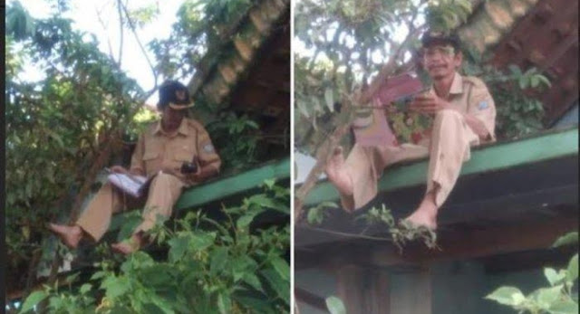 Bahkan guru itu berjuang mencari jaringan internet sampai harus naik ke atap rumah miliknya dan menjadi viral.