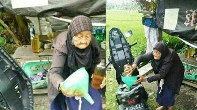 Wajah dan kulit pun terlihat sudah keriput. Meski demikian, nenek tersebut tampak masih bersemangat untuk berjualan bensin.